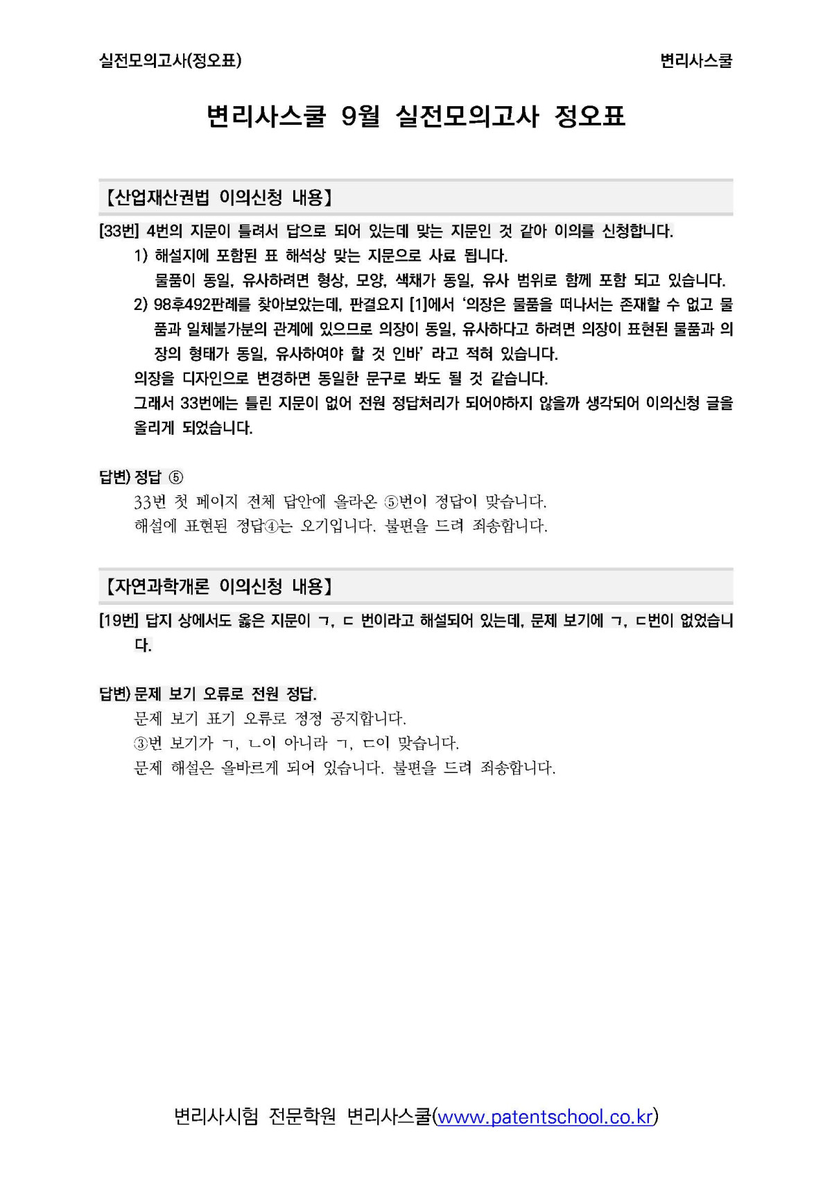 [변리사 모의고사] 변리사스쿨 THE PREMIUM 25년 9월 실전모의고사 이의신청 결과 공지 NEW